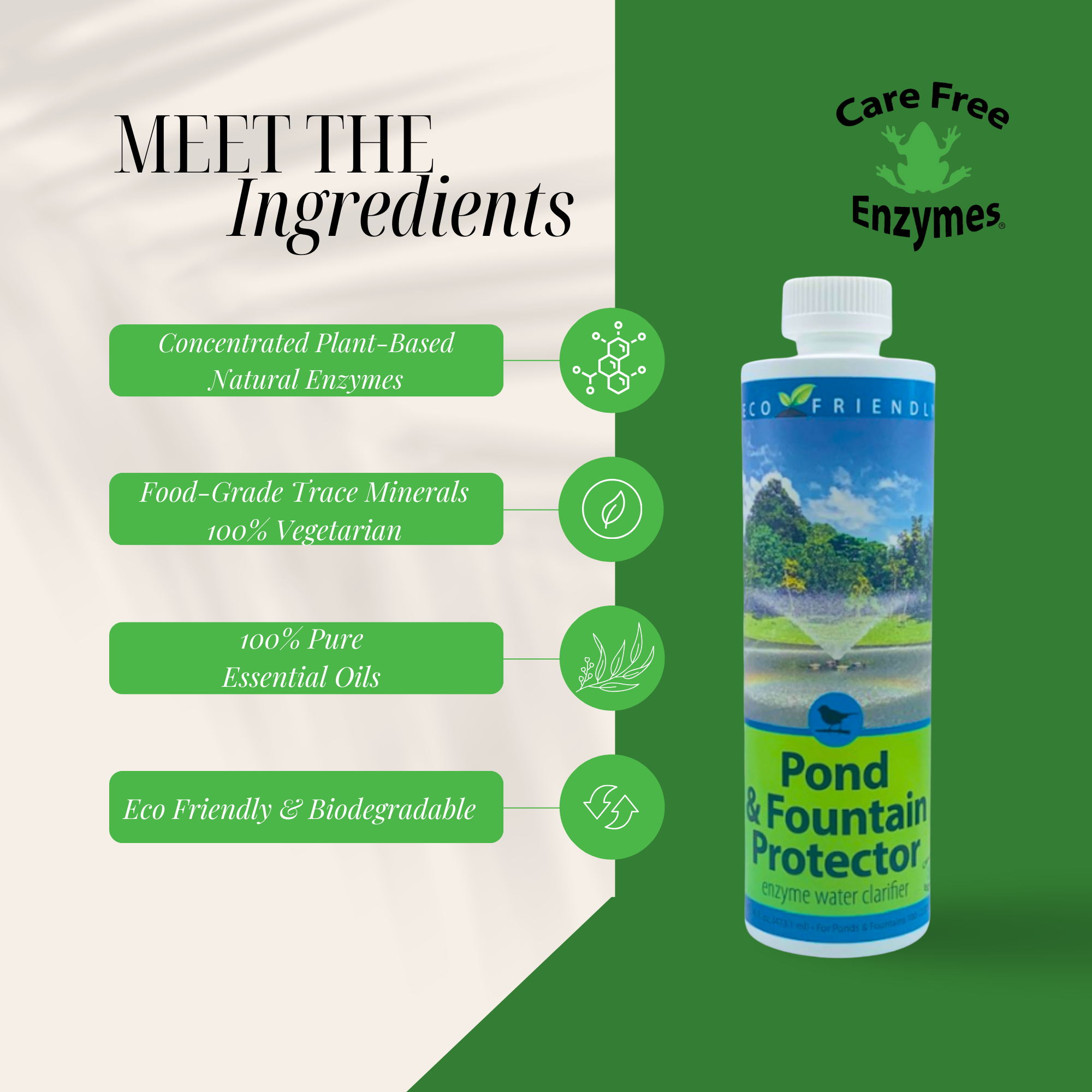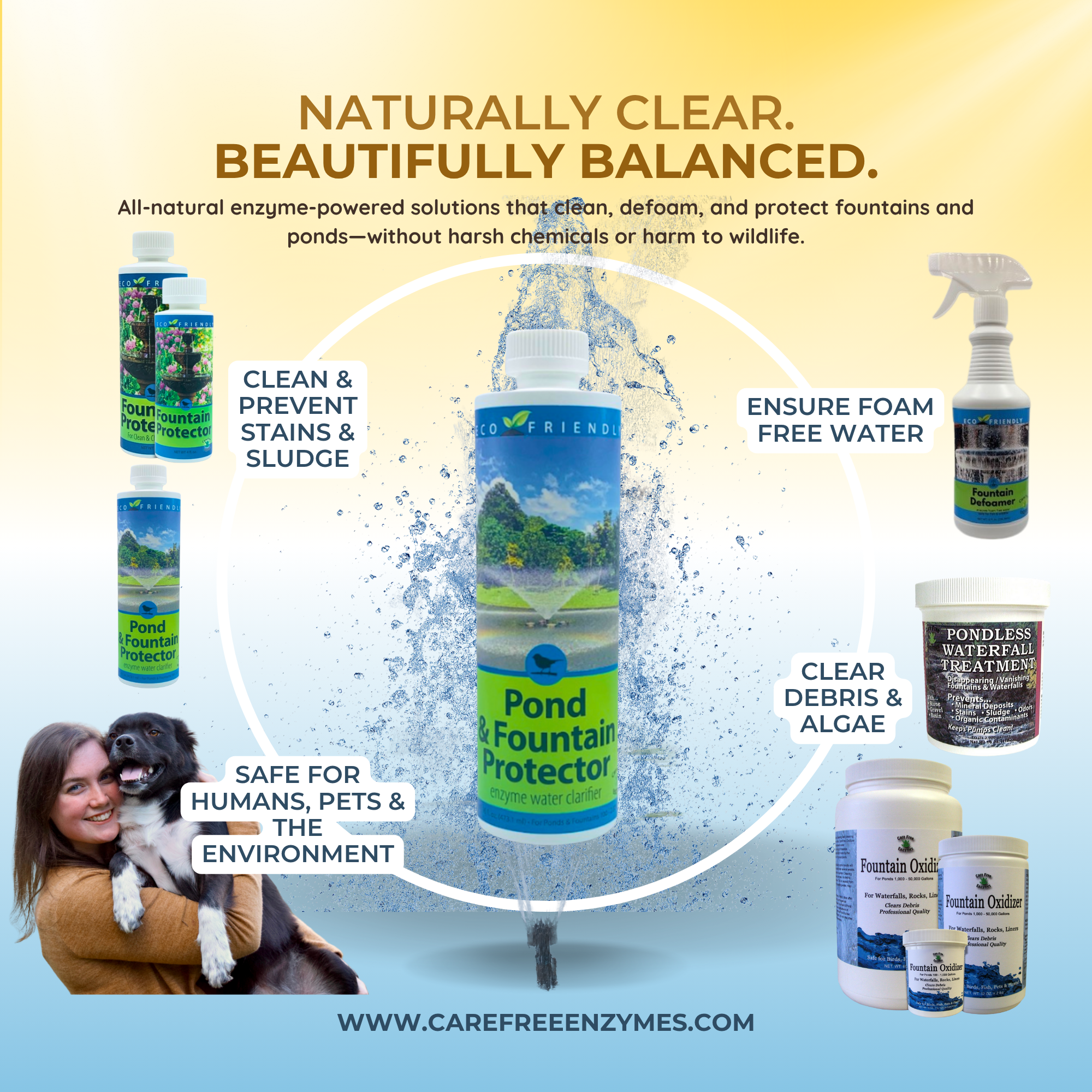 The ultimate all-in-one maintenance solution for all your decorative water features. CareFree Enzymes Pond & Fountain Protector is our proven, all-natural enzyme formula designed to keep the water in your ponds, fountains, and water gardens clear, clean, and healthy.