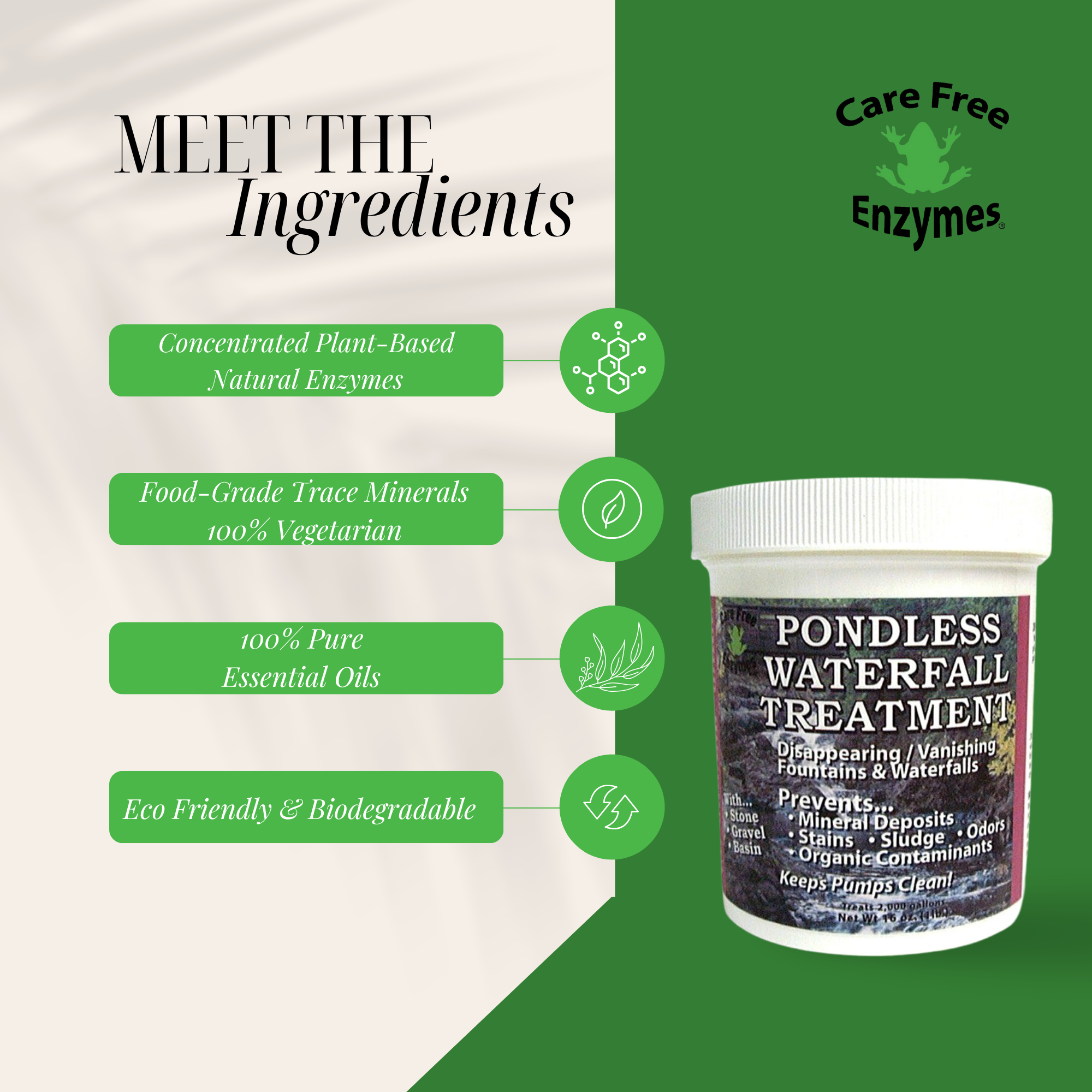 Keep the rocks and gravel in your pondless waterfall or stream looking beautiful and natural. Our Pondless Waterfall Treatment is a powerful, oxygen-based cleaner designed to remove the stubborn green algae and organic stains that build up on water feature surfaces.