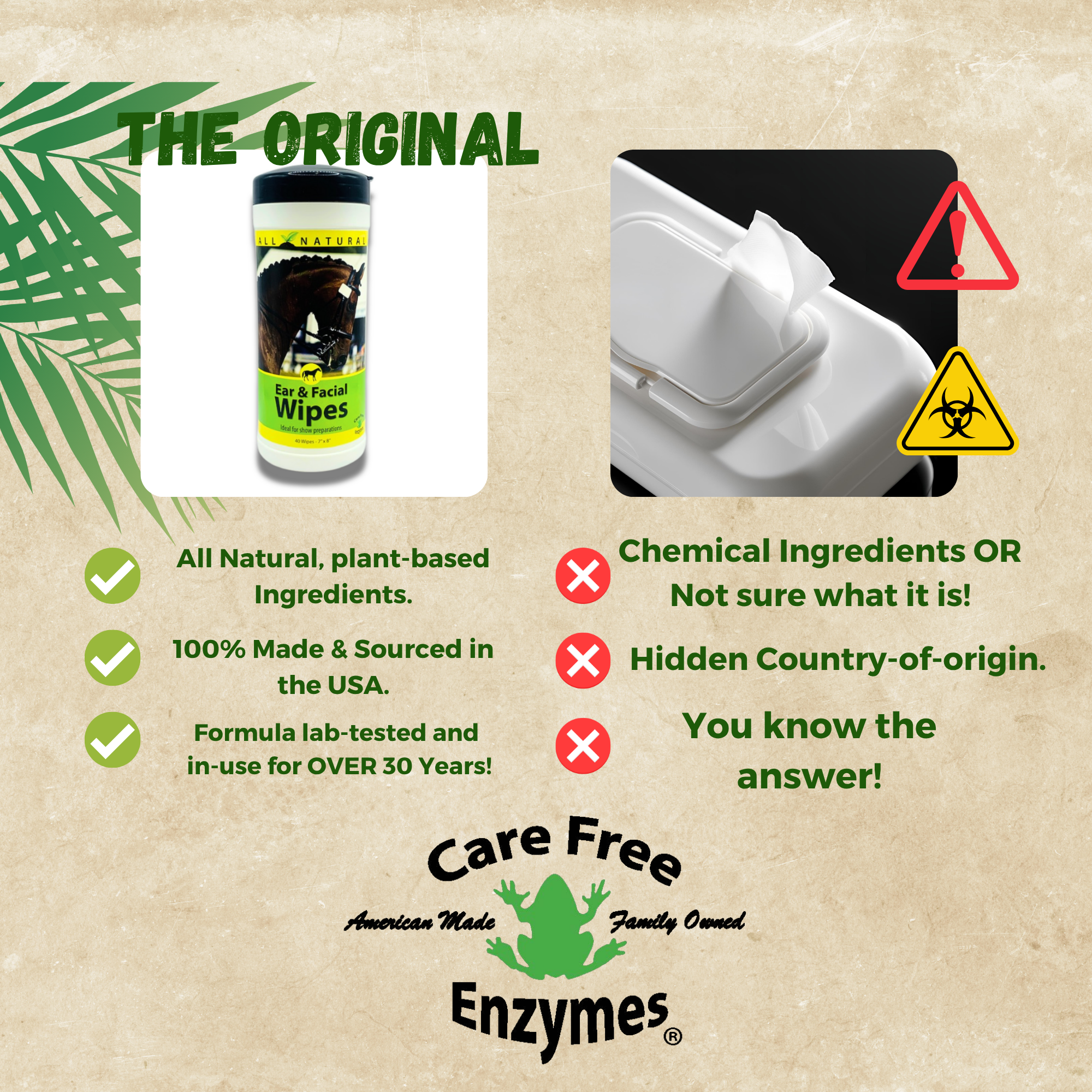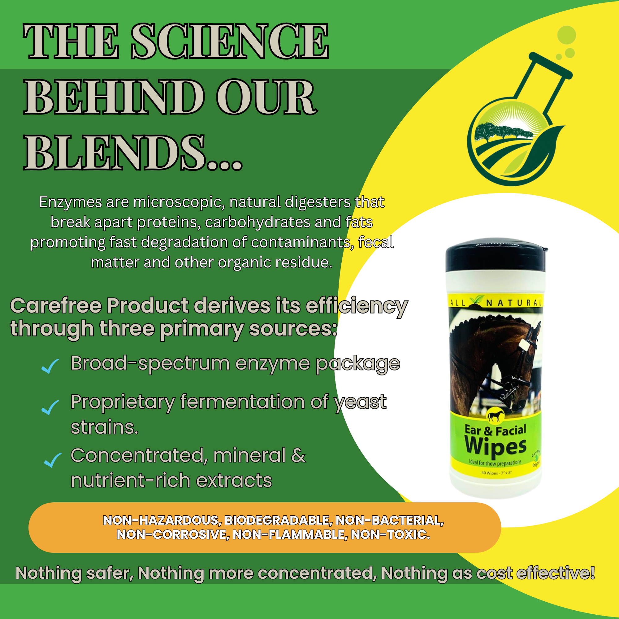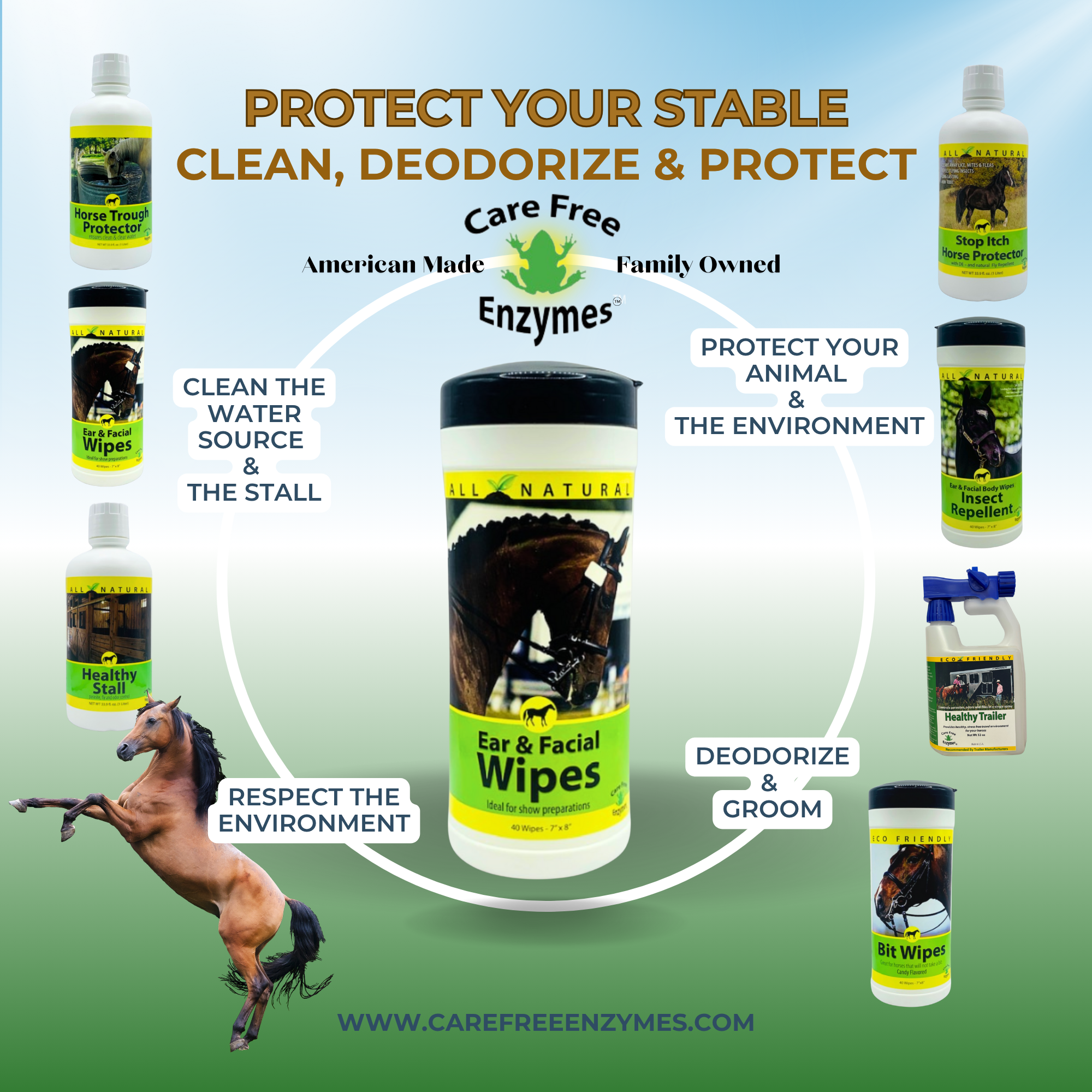 Gently clean the most sensitive areas of your horse with CareFree Enzymes Horse Ear & Facial Wipes. These ultra-soft, durable wipes are infused with our all-natural, non-toxic cleaning formula, making them perfect for safely removing dirt, dust, and sweat from around the face, eyes, and ears.
