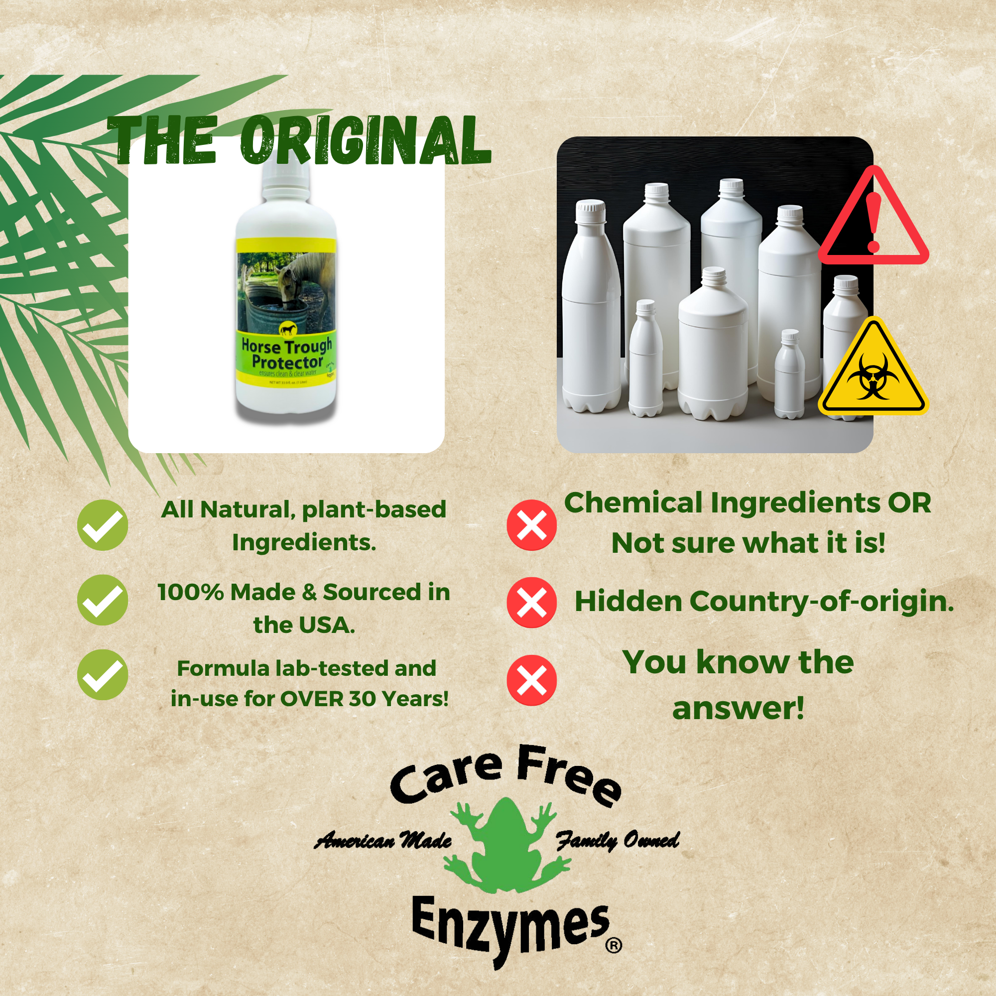 Spend less time scrubbing water troughs and more time with your horses. CareFree Enzymes Horse Trough Protector is an all-natural water treatment that works continuously to keep your stock tanks clean, fresh, and free of slimy buildup.