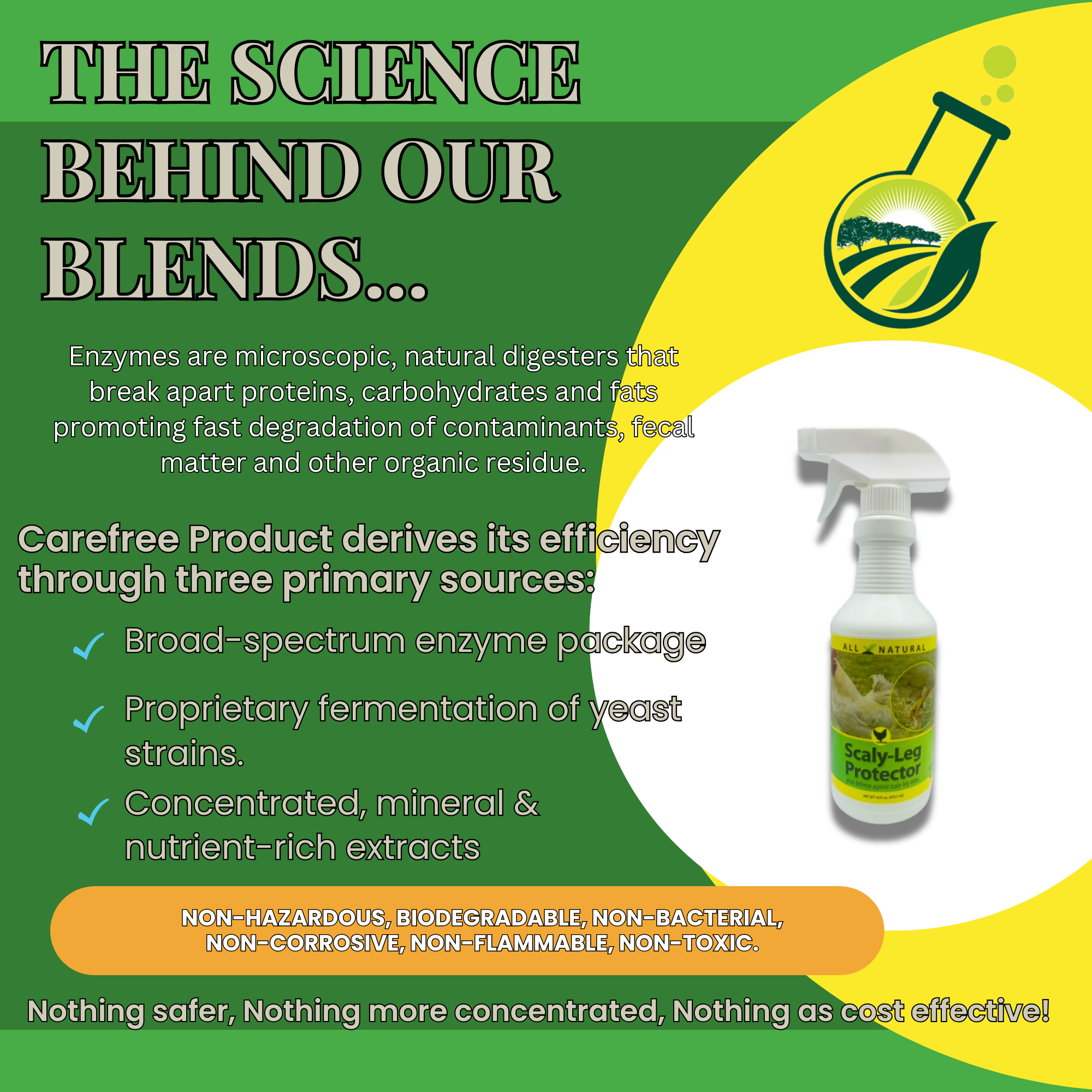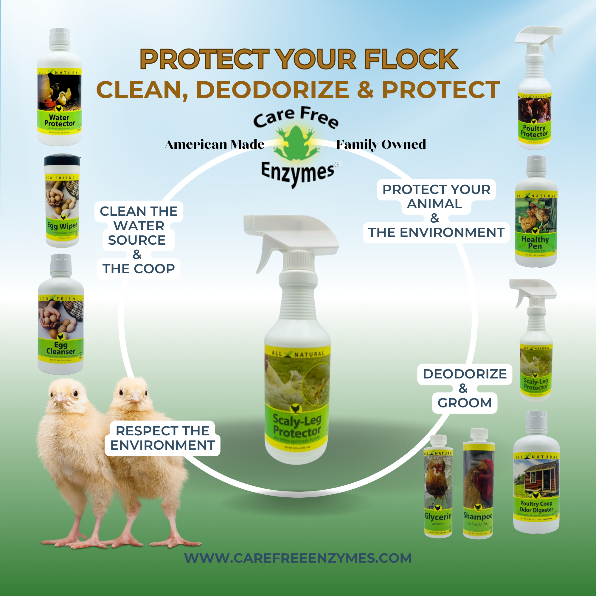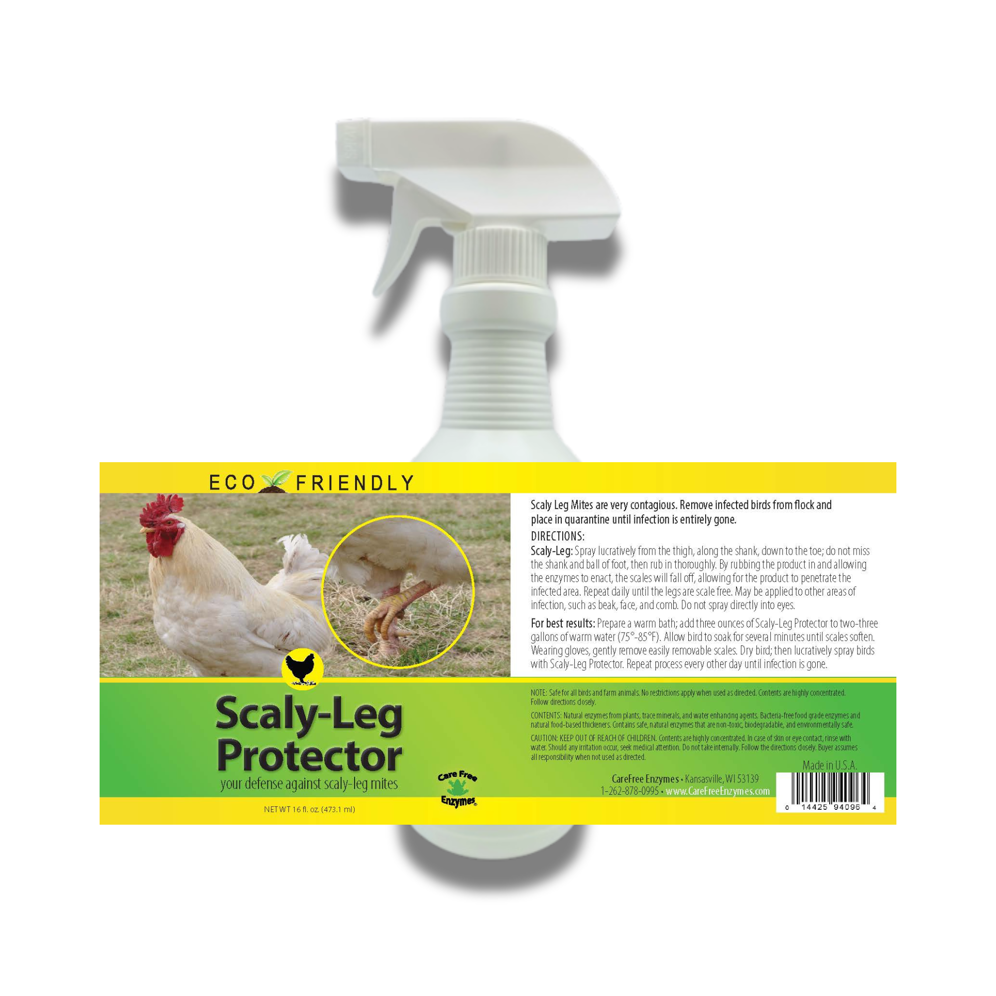 Provide safe and effective relief for your flock with CareFree Enzymes Scaly-Leg Protector. This all-natural, non-toxic spray is designed to combat scaly leg mites, which cause discomfort, irritation, and raised scales on the legs and feet of chickens and other poultry.
