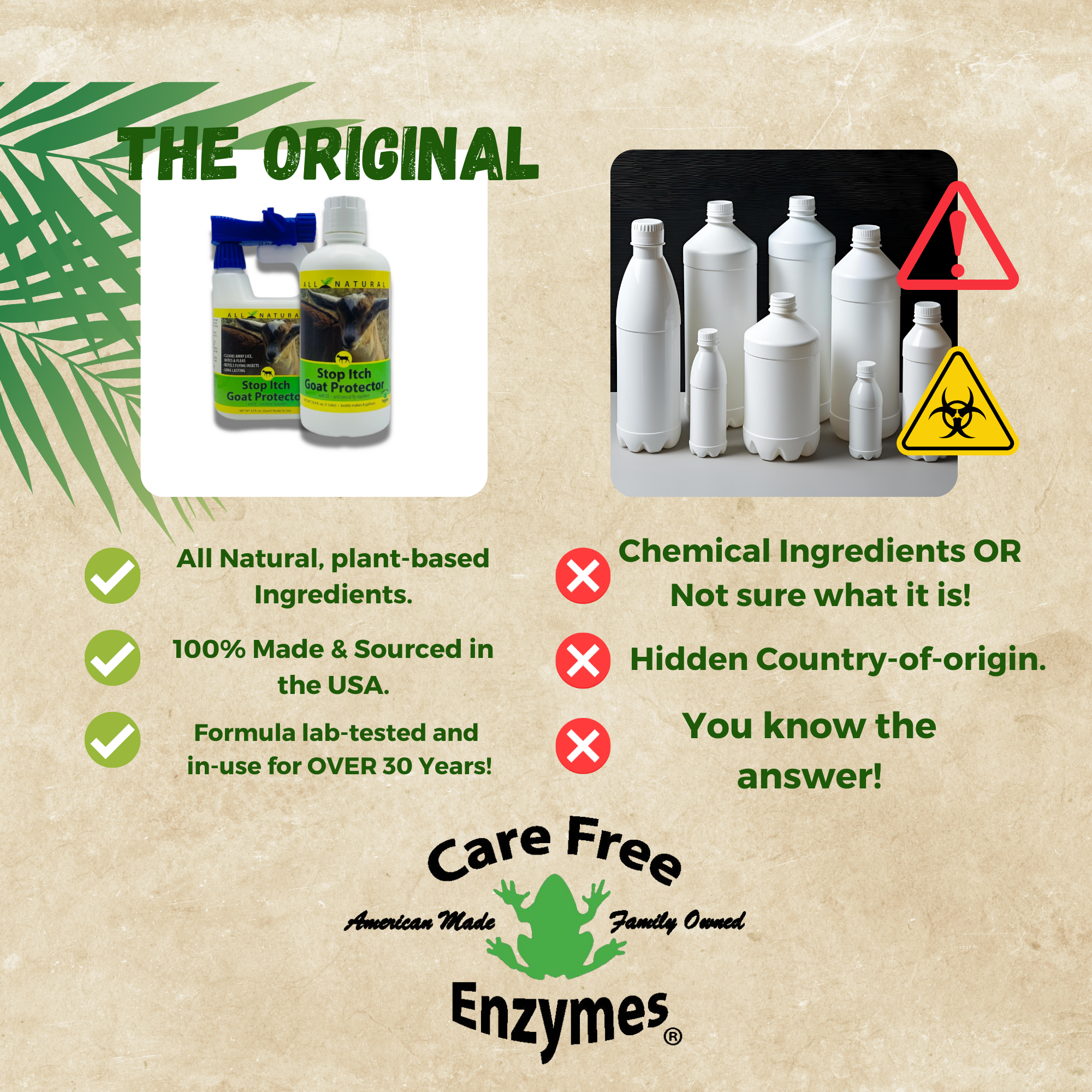 Give your goats immediate relief from persistent itching and skin irritation with CareFree Enzymes Stop Itch Goat Protector. This gentle, all-natural spray is designed to calm itchy skin caused by insect bites, allergies, and other common irritants, stopping the damaging cycle of rubbing and scratching.
