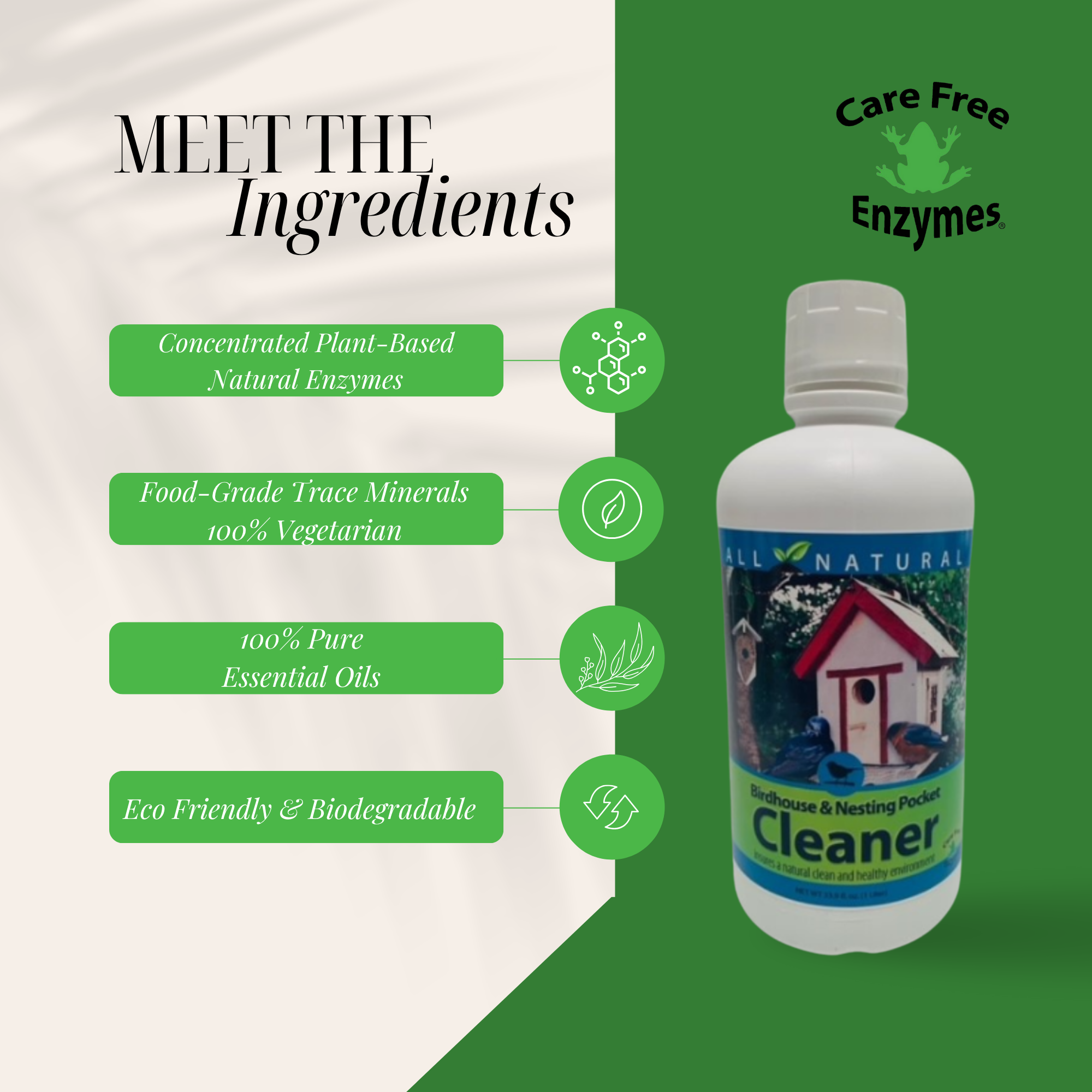 Ensure a clean, safe, and inviting home for returning birds with our all-natural Birdhouse, Nesting Pocket & Gourd Cleaner. This enzyme-based formula is designed to safely clean and deodorize all types of bird shelters, from traditional wooden houses to natural gourds and fabric nesting pockets.