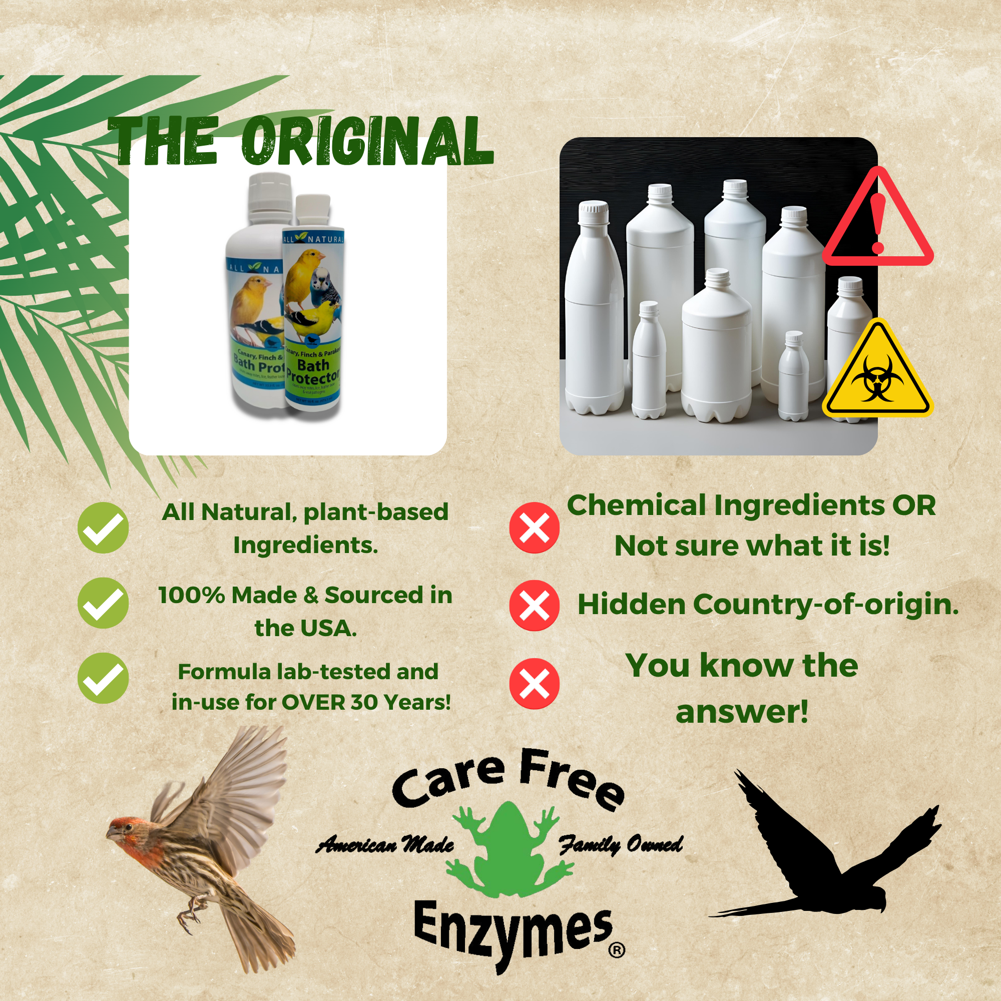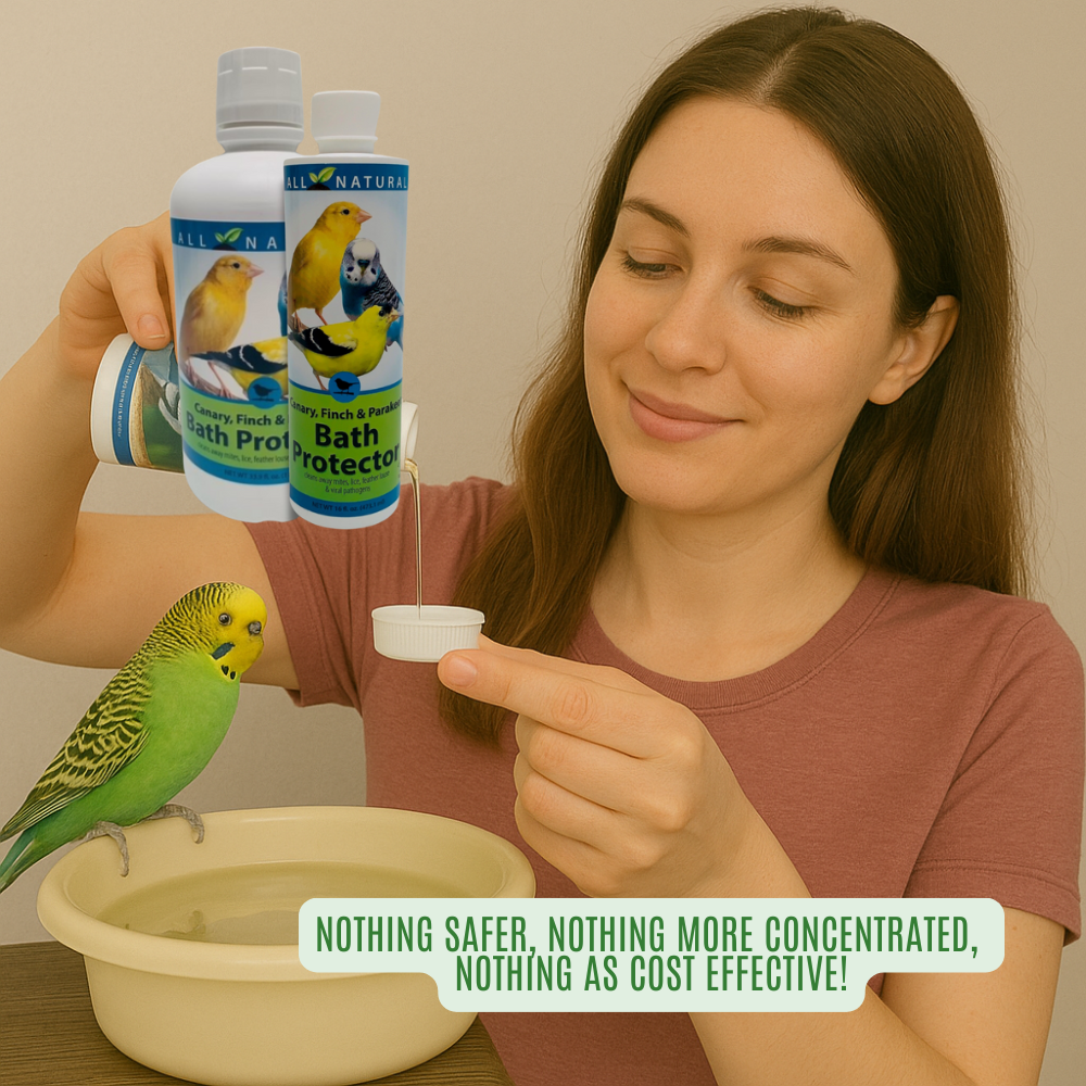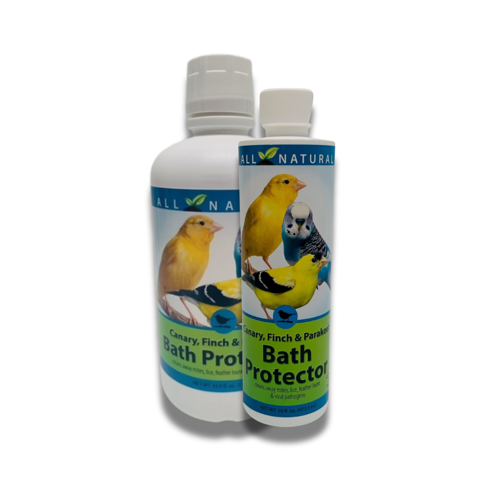 Keep your pet bird's bath water fresh, clean, and inviting with our all-natural Bath Protector. This gentle, enzyme-based formula is specifically designed for cage birds like canaries, finches, and parakeets, working to keep their bath water clean and clear between changes.