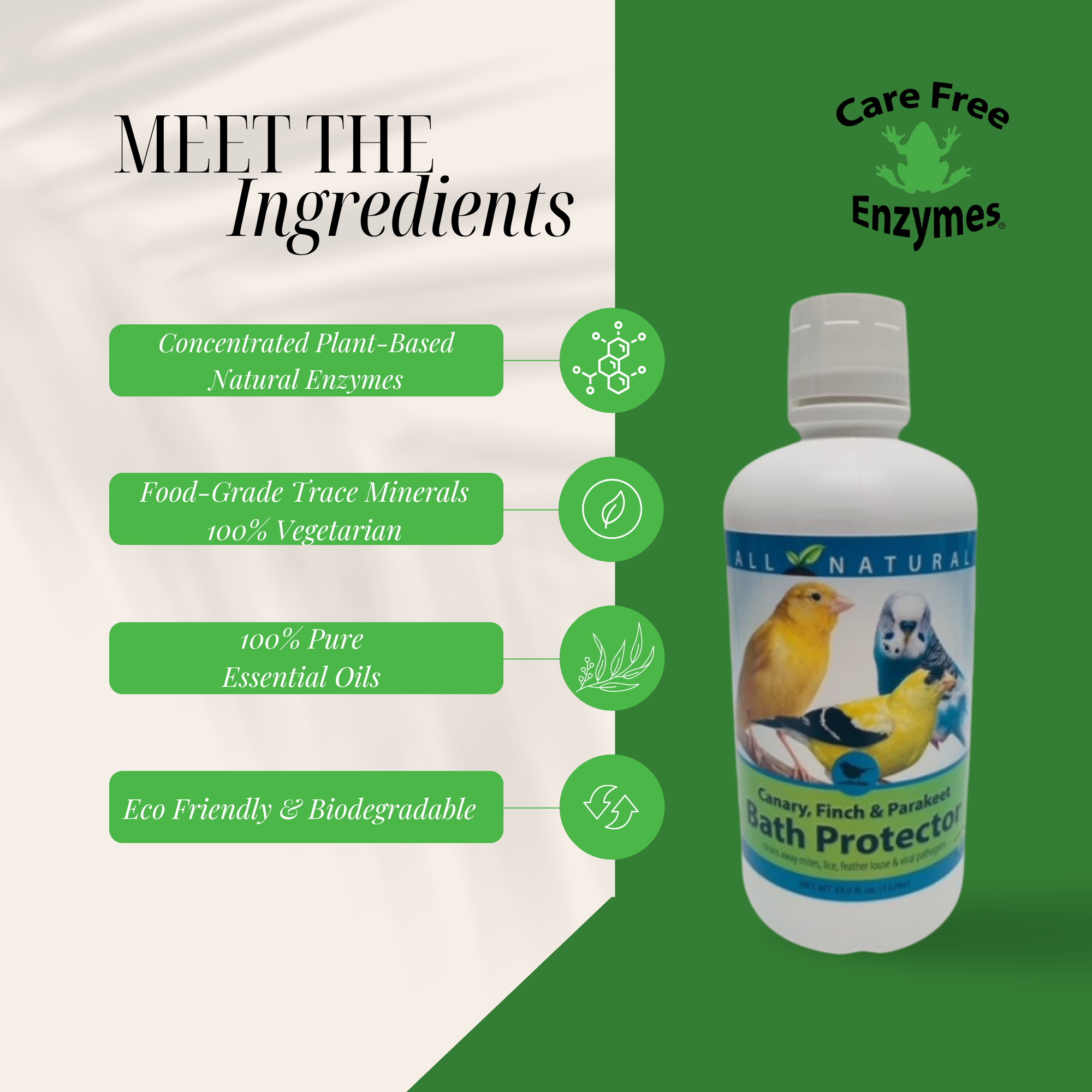 How It Works: This formula uses a proprietary blend of natural enzymes that safely break down the microscopic organic debris that can cloud bath water. By keeping the water clean on a microscopic level, it provides a healthier and more appealing bathing environment for your pet bird.