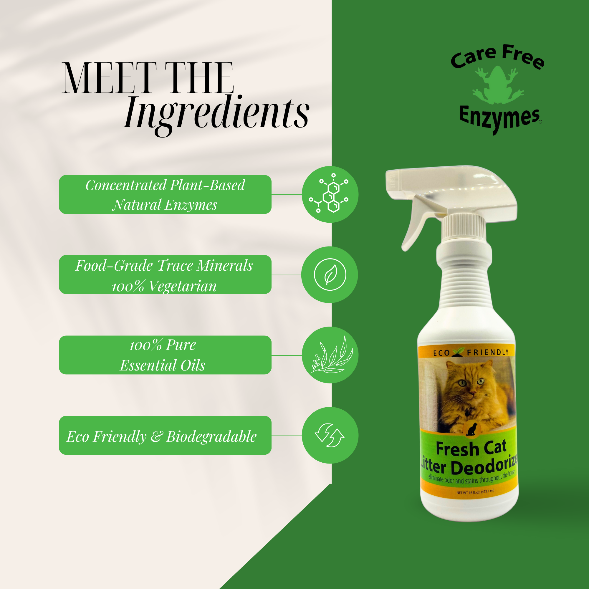 Eliminate litter box odors at their source with CareFree Enzymes Fresh Cat Litter Deodorizer. This powerful, unscented enzyme spray is designed to target and digest the odor-causing bacteria and ammonia in your cat's litter box, leaving it smelling fresh and clean without any perfumes.