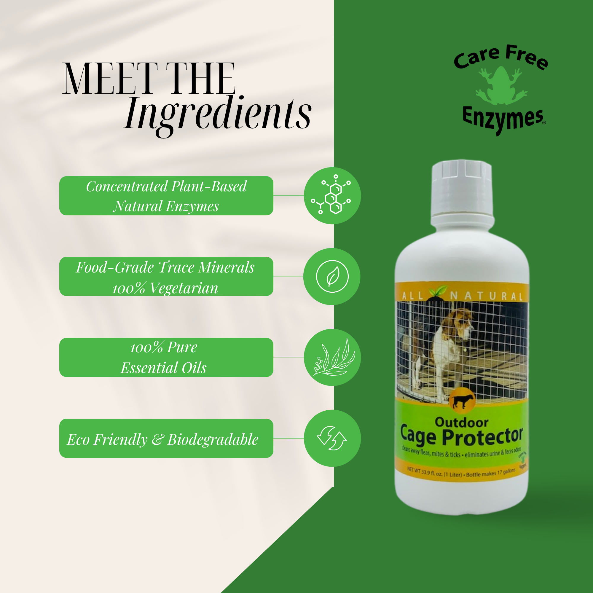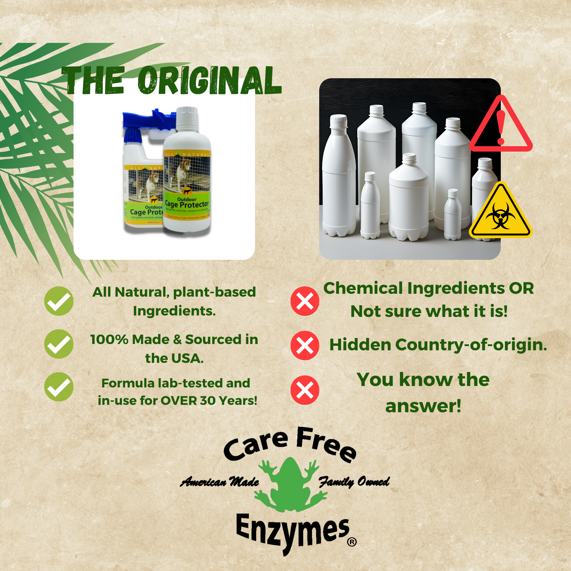 Keep your pet's outdoor living spaces clean, sanitary, and odor-free with CareFree Enzymes Outdoor Cage & Kennel Cleaner. This powerful, all-natural enzyme concentrate is designed to break down and eliminate the toughest pet waste odors on surfaces like concrete, gravel, and artificial turf.