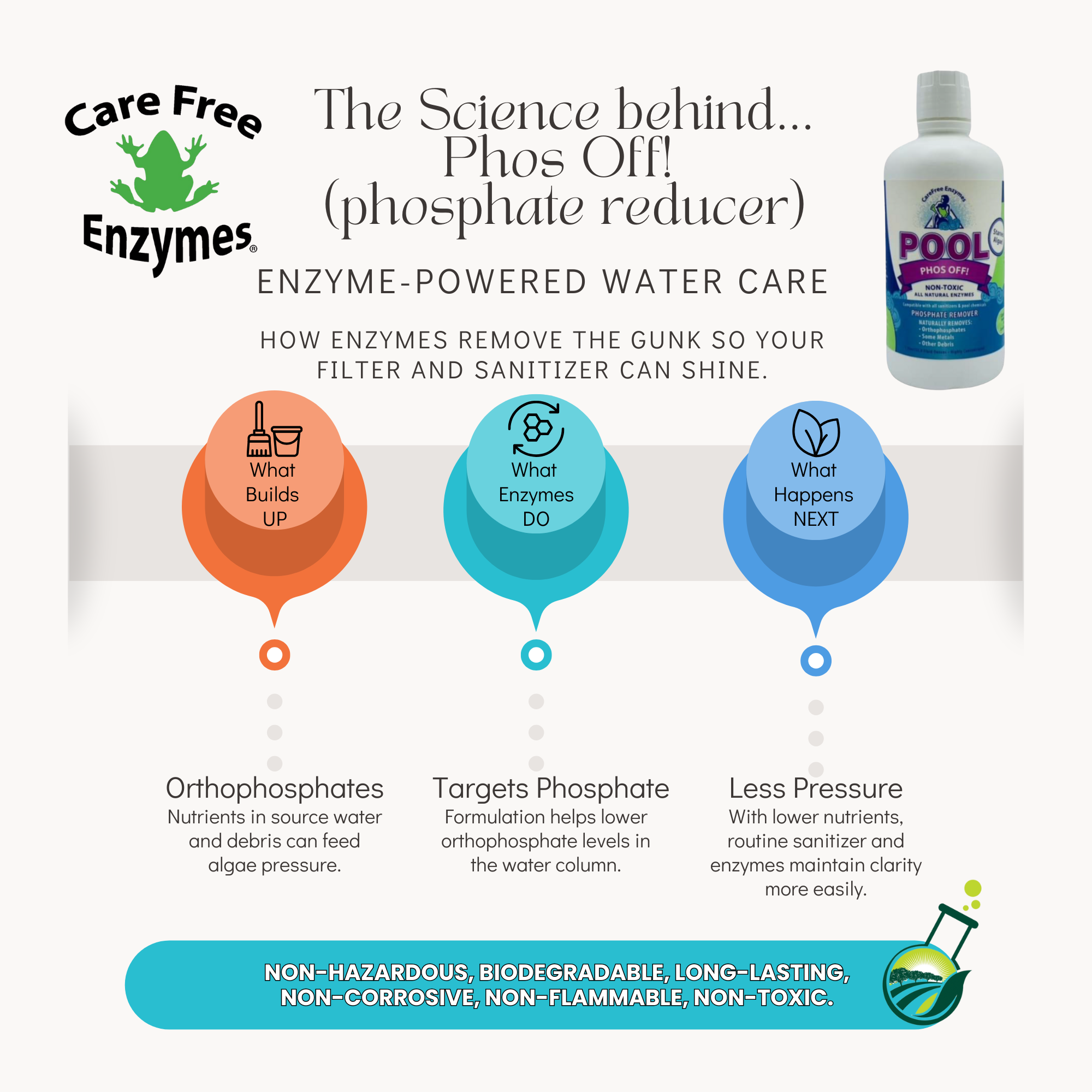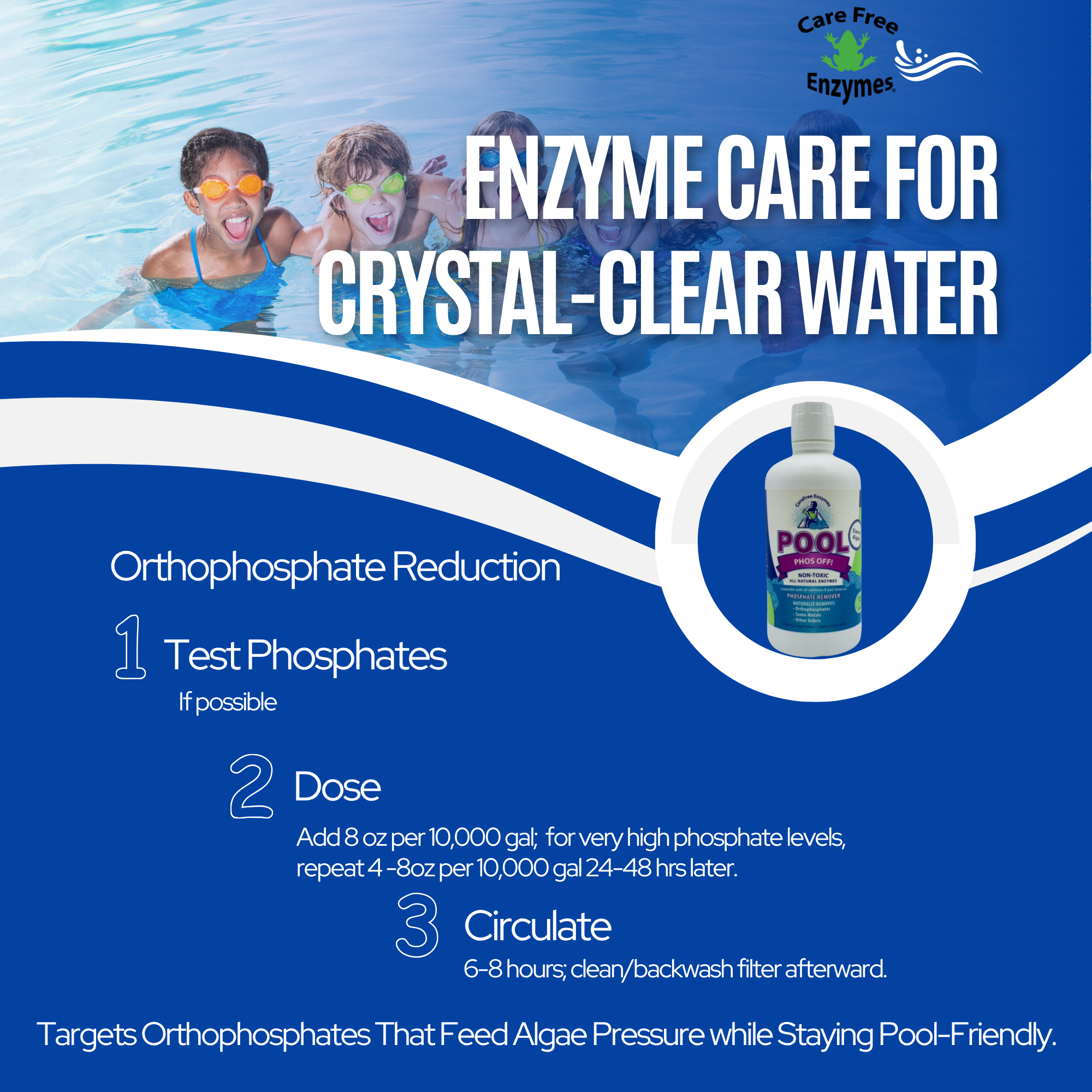 Stop algae before it starts by removing its primary food source. CareFree Enzymes Pool Phos Off is a powerful, concentrated formula designed to bind to and eliminate phosphates from your pool water, creating a cleaner, clearer, and more manageable swimming environment.
