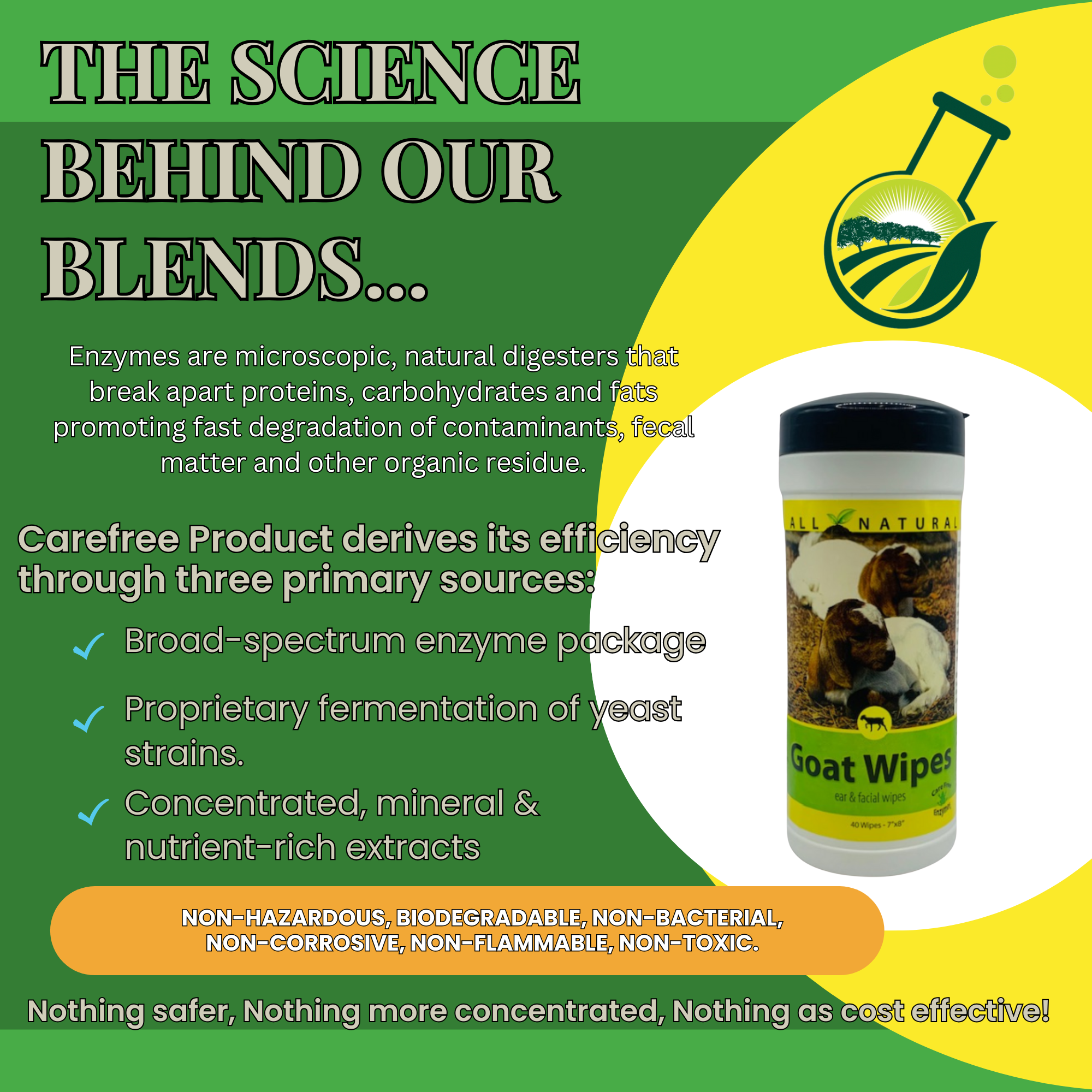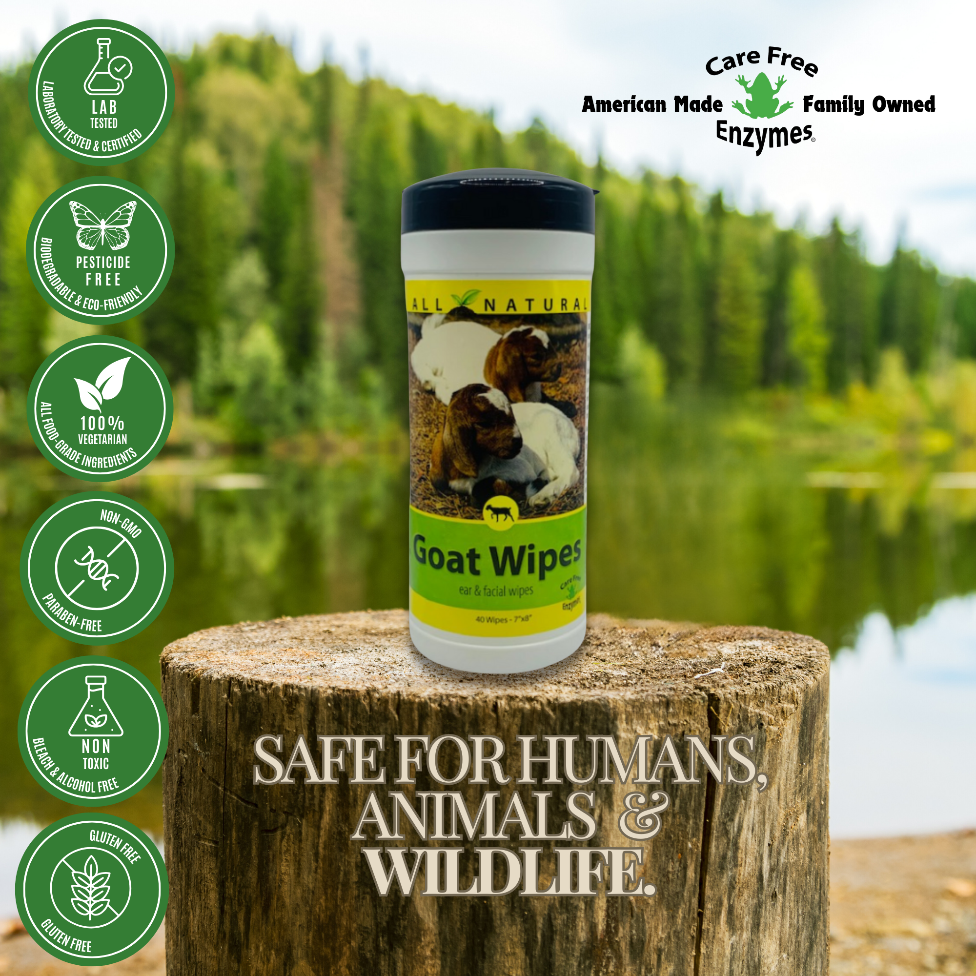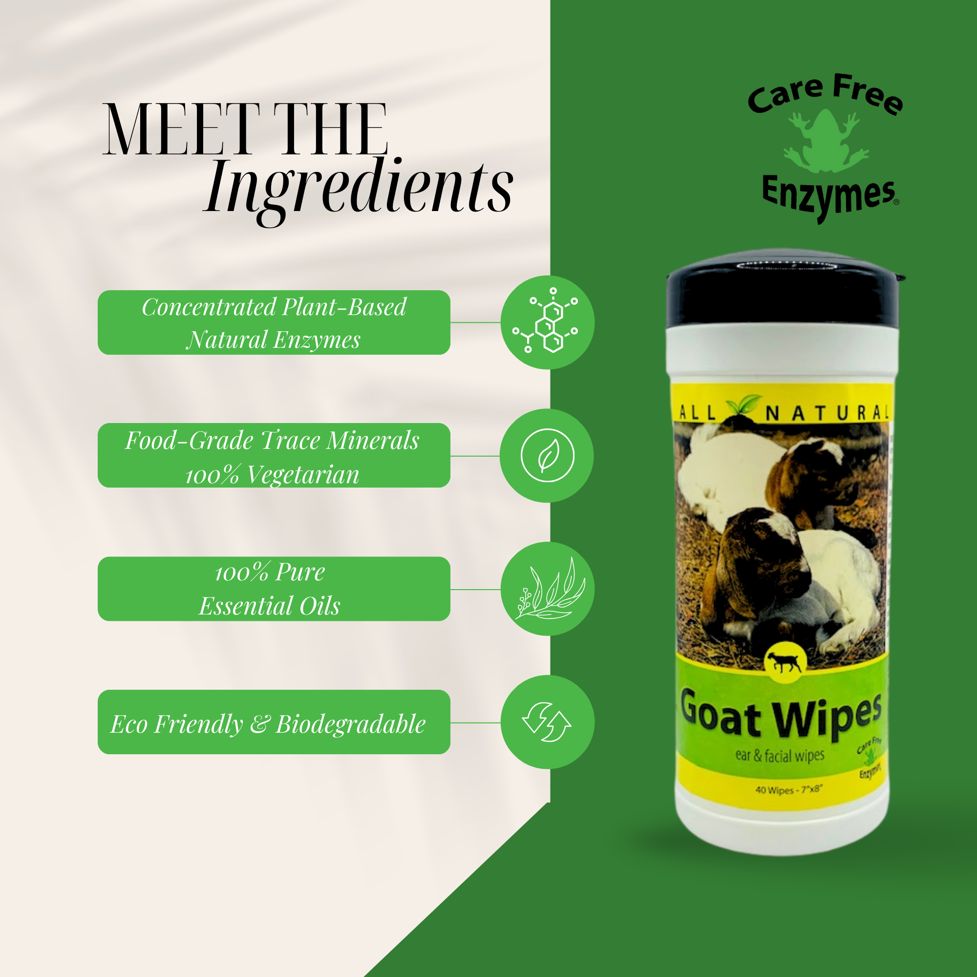 The perfect all-purpose cleaning solution for your goat herd. CareFree Enzymes Goat Wipes are gentle, durable, and pre-moistened with our all-natural, non-toxic formula, making them ideal for quick cleanups on faces, beards, and bodies, especially at a show or in the barn.